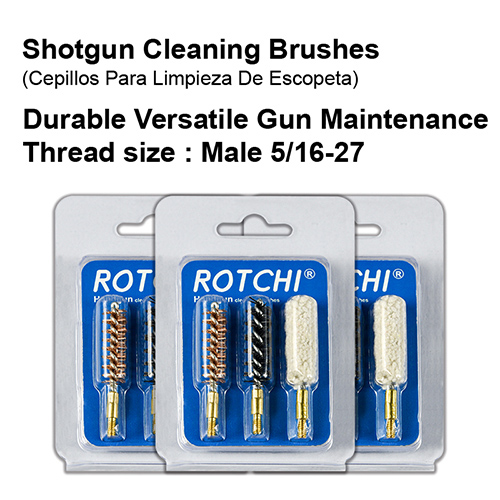 Šratų valymo šepetys 3-in-1 rinkinys, lizdinė plokštelė ir kortelė paketą. Galimi dydžiai: 12G, 16G, 20G, 410
